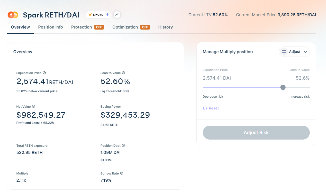 Probably the feature Summer is known for most is available on Spark Protocol through the Multiply feature. This allows you to perform multiple steps in a single transaction, such as depositing capital, borrowing against it, buying more capital with the borrowed debt, and depositing that back into the Spark position. This allows you to get to 2 or 3x exposure in a single transaction, or repay using your collateral and even close in one step without needing any balance in your wallet.