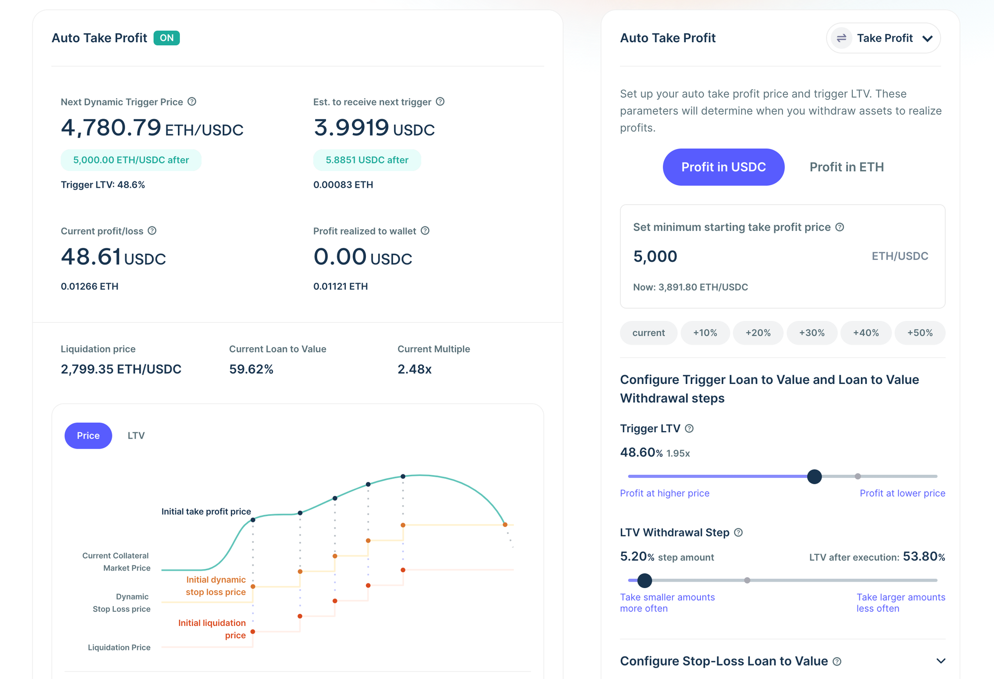 Auto take profit allows you to set a specific price and LTV to start realizing profits; you can then configure it to continue taking profits when a specific trigger LTV is hit.