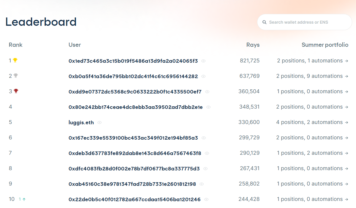Don’t forget to monitor your $RAYS allocation at Summer.fi/rays and track your progress on the leaderboard at Summer.fi/rays/leaderboard 🏆