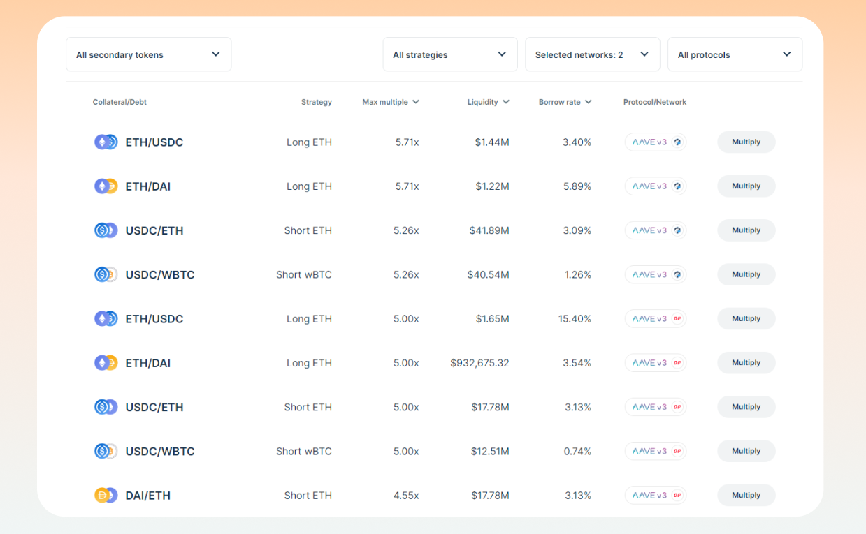 Our support of Aave v3 on L2s significantly enhances your borrowing experience. Deposit collateral and draw debt without being burdened by high gas fees and in a single transaction. Our range from ETH/USDC to cbETH/USDC ensures you have all the needed options.