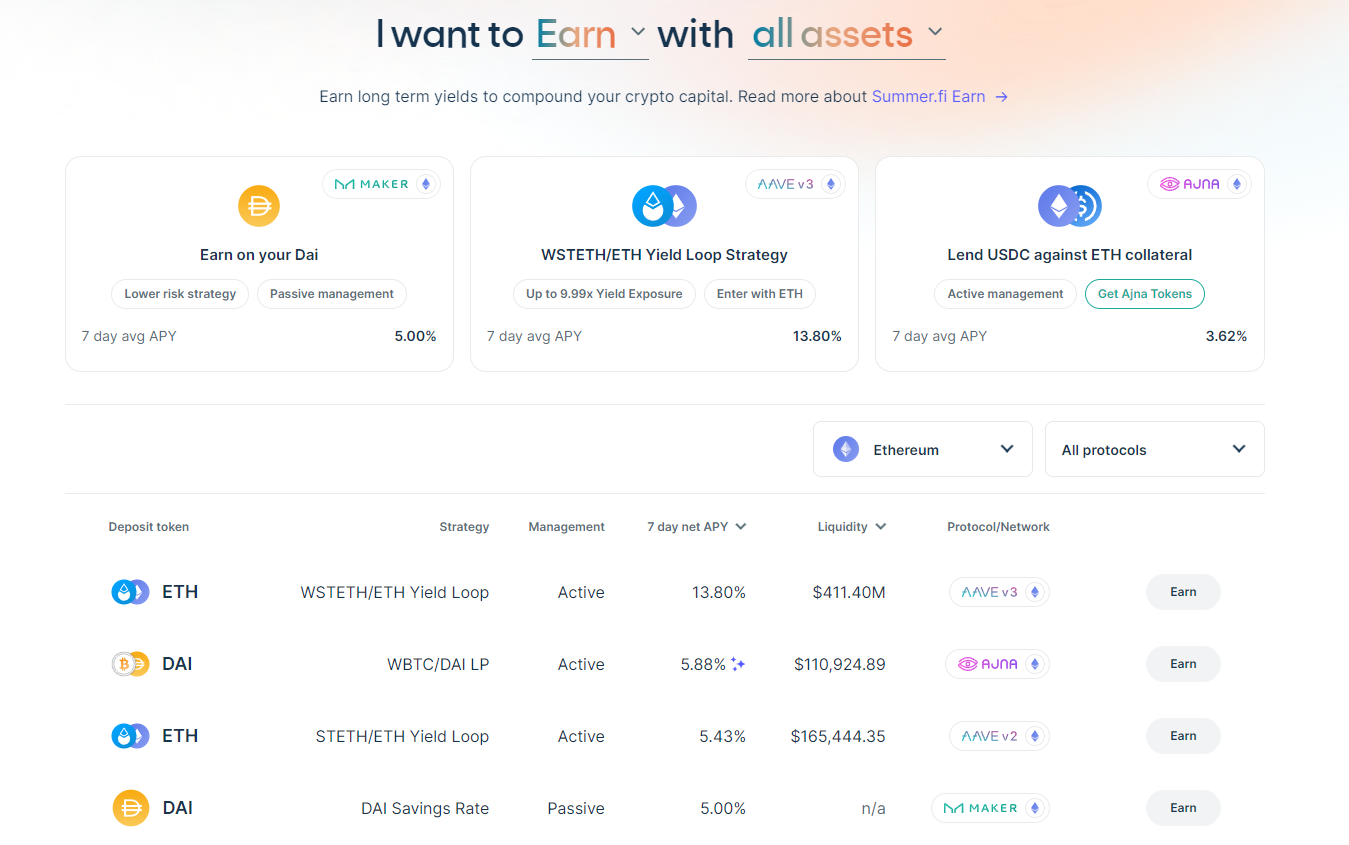 Alex has 2000 DAI idle in his wallet, and he wants to start earning some yield on them. The first move is going to https://summer.fi/earn/dsr/, and depositing his DAI into de DSR. Now, his DAI is deposited in MakerDAO, which pays him an annual rate of 5%. In exchange for the deposited DAI, he gets sDAI, and this is where the fun begins. This yield-bearing token will accrue yield by just being in his wallet, but Alex wants more, so using https://summer.fi/ethereum/aave/v3/earn/sdaiusdc#simulate he deposits his sDAI into this strategy, which will deposit his sDAI, borrow USDC, which will be swapped for more SDAI. Alex now is earning a multiplied yield of his sDAI; your imagination is the limit regarding Money Legos in DeFi!
