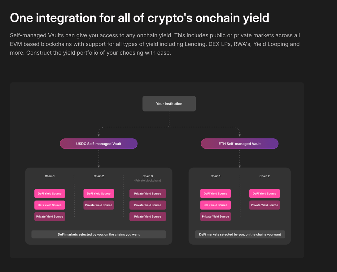 Instead of building a dozen connectors, connect once to a vault layer you can shape to your mandate. Institutional vaults expose both public (DeFi) and private/whitelisted markets; you define assets, venue caps, reallocation logic, and reporting—ring-fenced, non-custodial, and auditable.