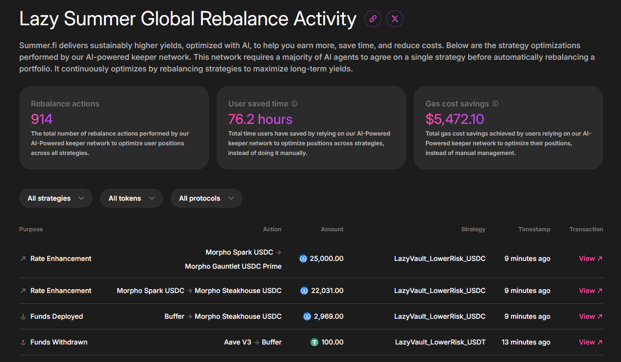 One of the biggest challenges in DeFi is that yield opportunities continuously fluctuate across strategies and protocols. The Lazy Summer Protocol’s AI-powered keepers continuously monitor the market and: