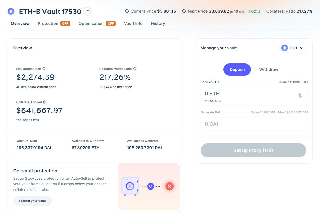 - Vault Overview: Use the Overview tab of your position to get a comprehensive view of your vault's status, including vault debt, collateral value and liquidation price.