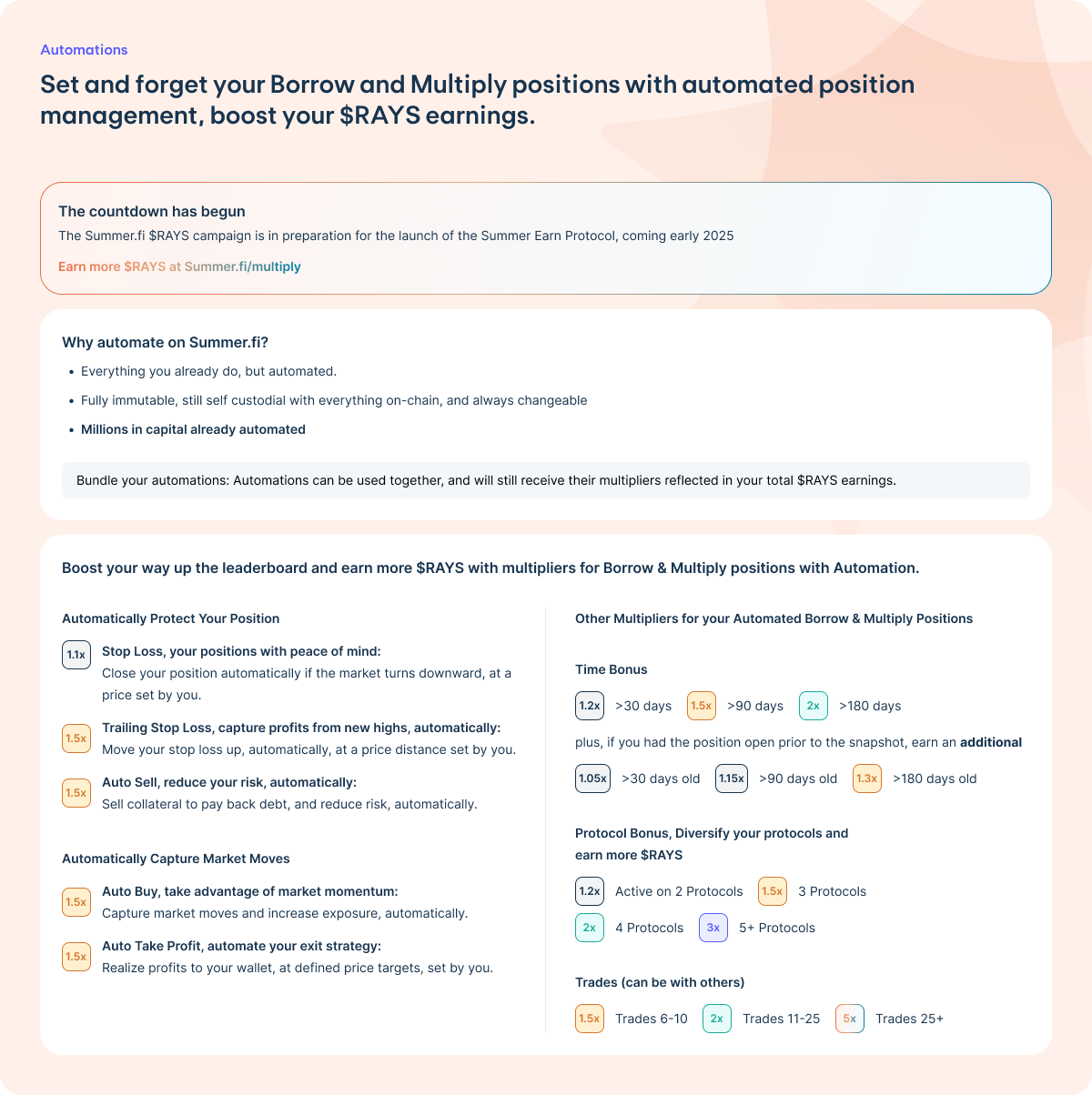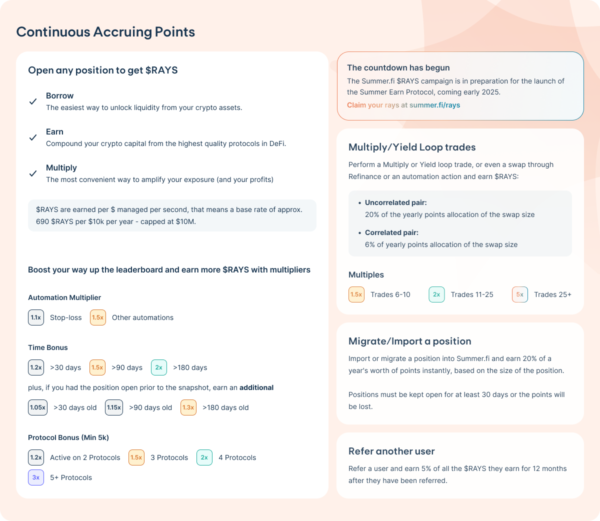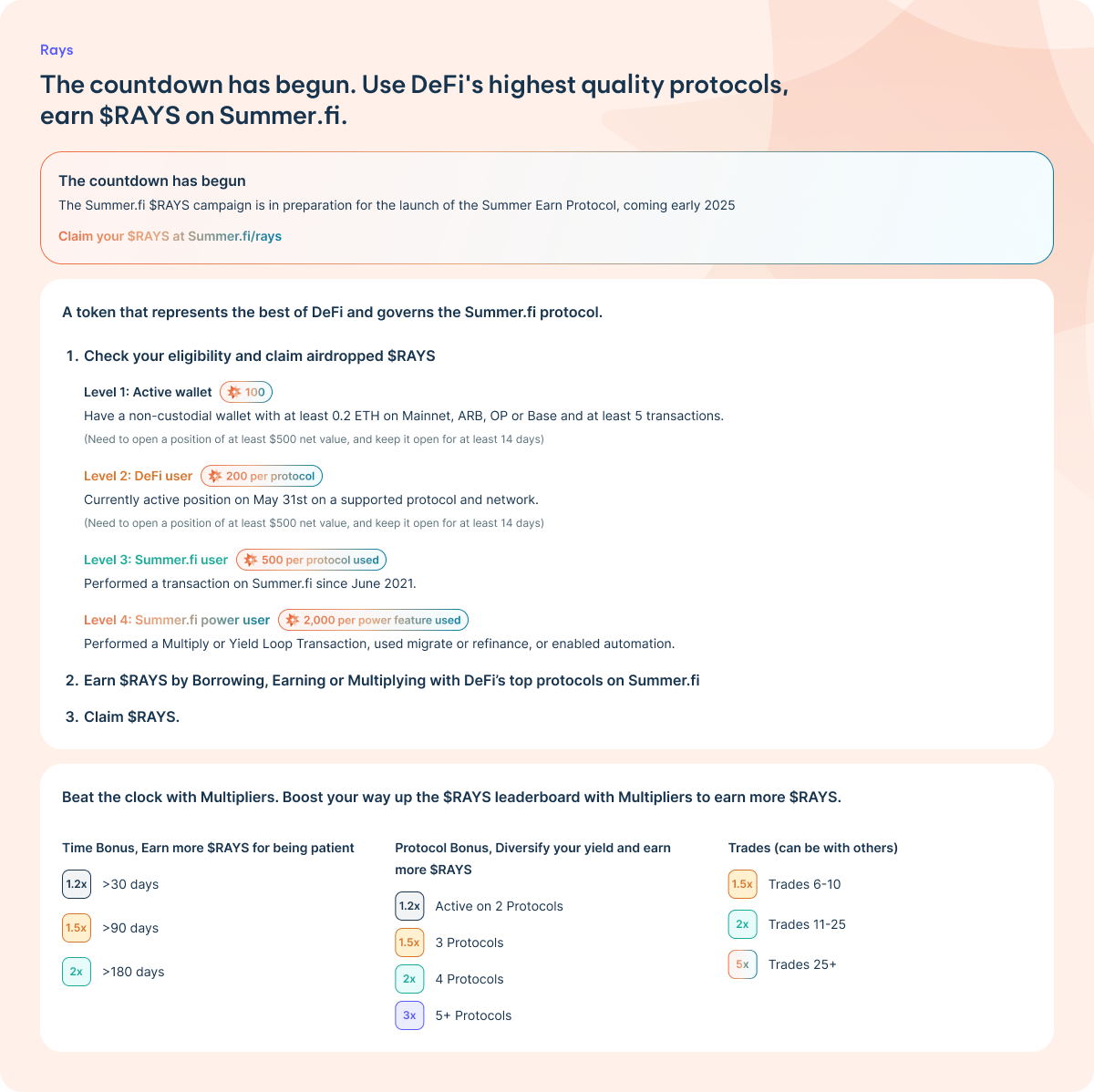 - $RAYS can be earned by borrowing, earning, or Multiplying on Summer.fi. Earning can be accelerated with Multipliers for automation, time usage, trades quantity, and diverse protocal usage.