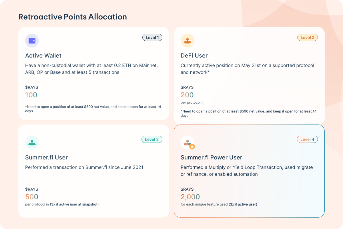 - 4 levels of users are eligible for the airdrop at Summer.fi/rays