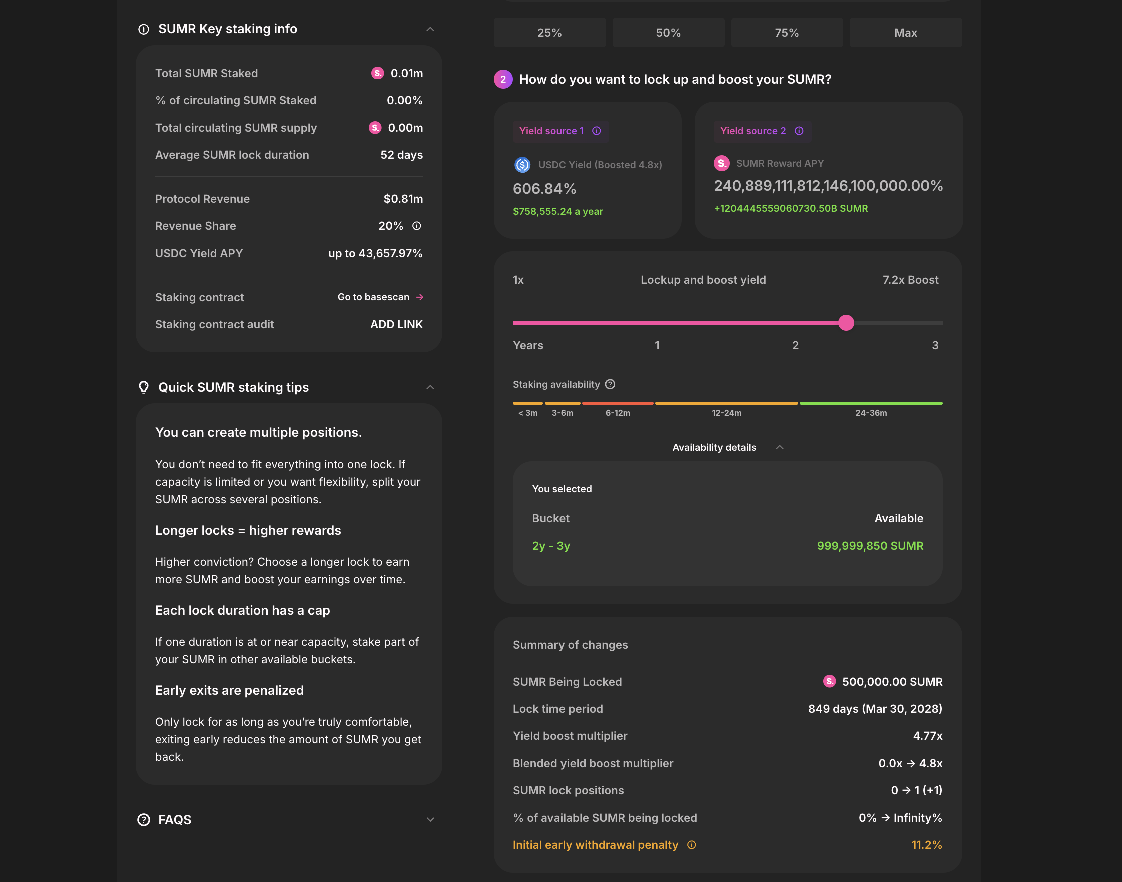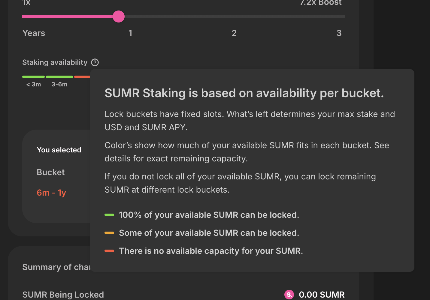 - Conviction based time based lock buckets: New in staking v2 is also the option to lock your staked SUMR for specific amounts of time, which in turn boosts your potentiality to earn both SUMR and USDC rewards.