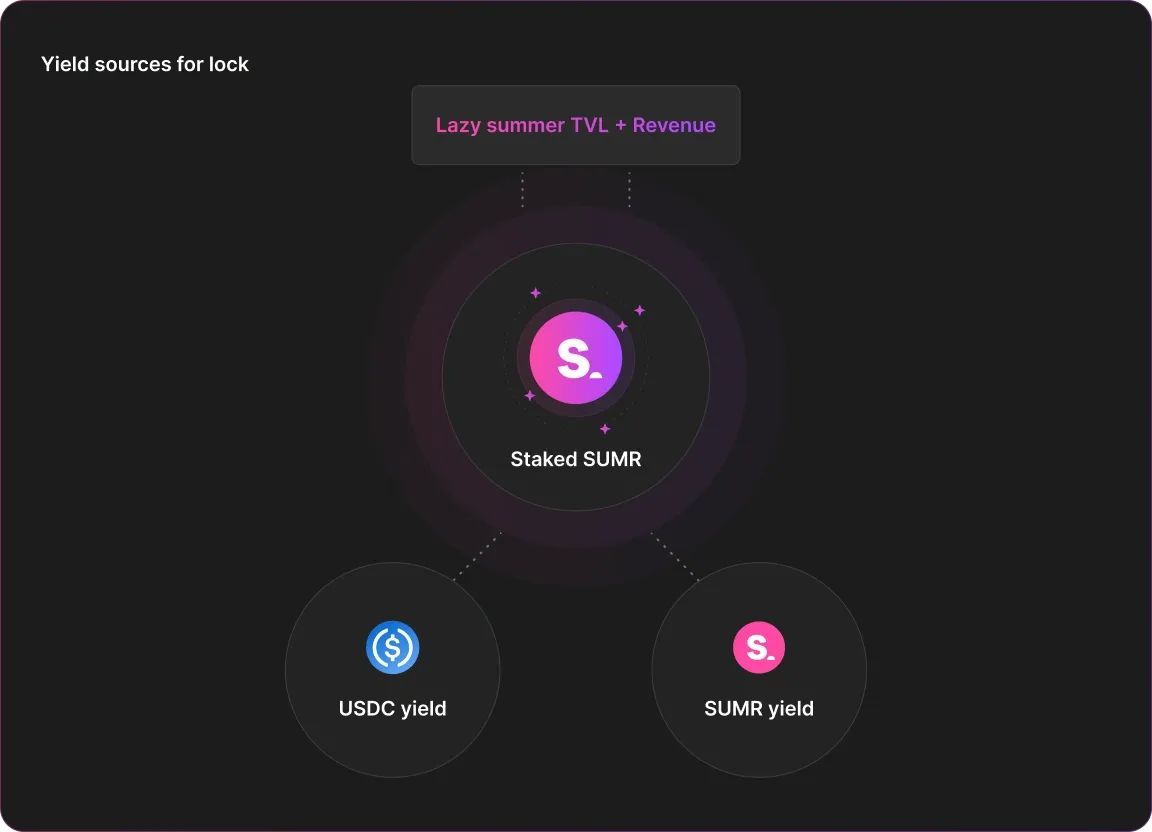 A portion of protocol revenue (currently 20% of protocol yield) is routed to lockers as USDC-denominated LV vault tokens. These tokens keep compounding automatically in Lazy Summer’s strategies. As TVL, usage, and institutional adoption grow, protocol revenues can grow, and so does the potential USDC you earn for locking SUMR.