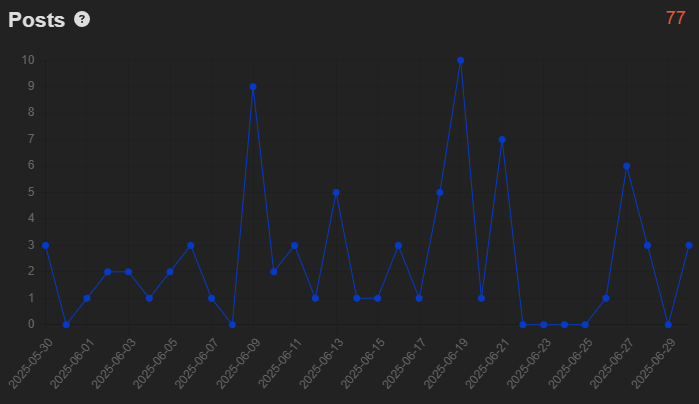 A total of 77 posts were recorded, with couple of noticeable spikes. Despite occasional dips, the overall trend suggests sporadic but responsive community participation.