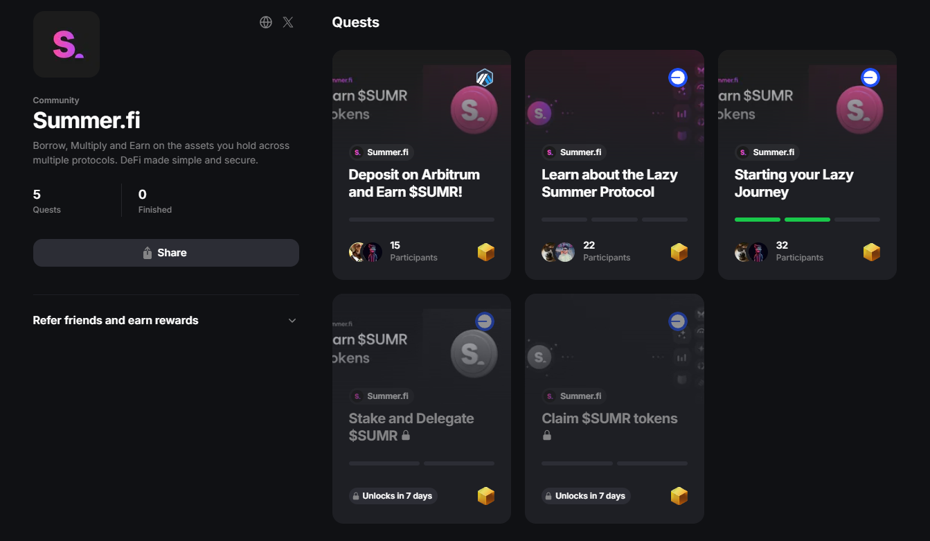 The campaign is designed to make your experience smooth, engaging, and effortless. By completing simple quests, such as joining our Discord or staking your $SUMR, you can earn rewards while learning all the advantages of the Lazy Summer Protocol!