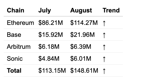 Total TVL surged by $35M in August, driven primarily by Ethereum (+$28M) and Base (+$6M). Every chain saw growth.