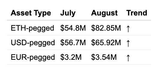 ETH-pegged assets soared (+$28M), USD-pegged climbed +$9M, and EUR-pegged continued its steady growth with +$0.3M. This mix shows a broad expansion across all asset types, which is great to see.