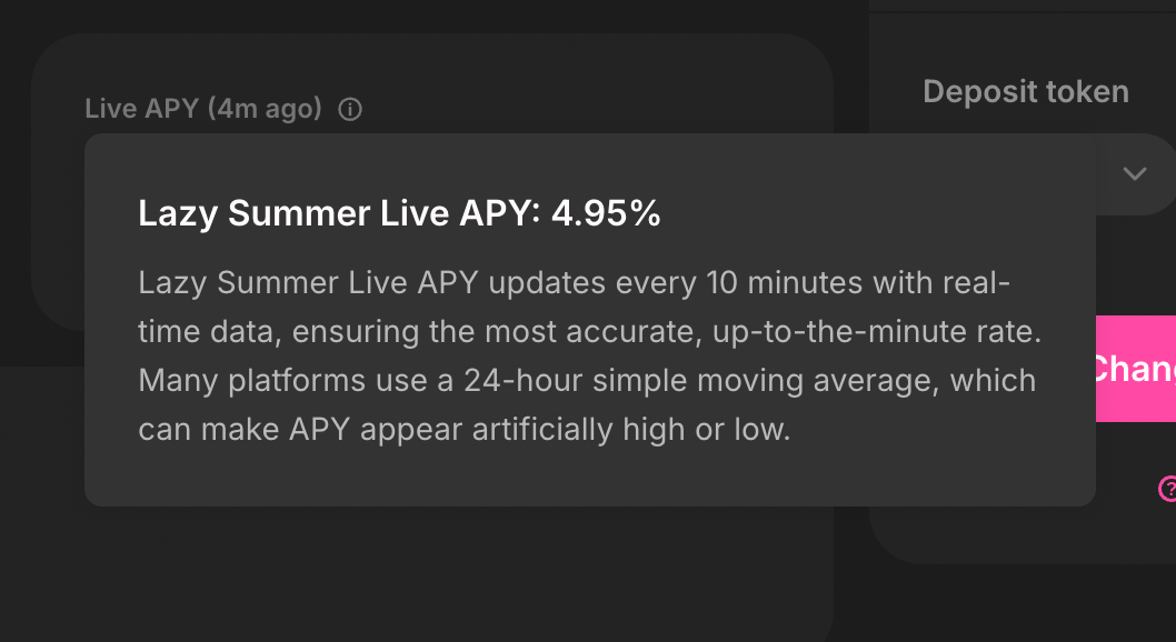 - Live APY—updated every 10 minutes, so rates are never stale or artificially smoothed.