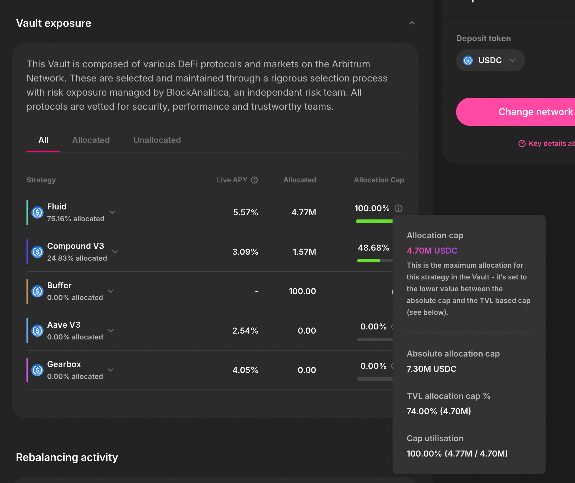 - Allocation caps—each vault now shows how deposits are distributed across underlying protocols, keeping risk visible and controlled.