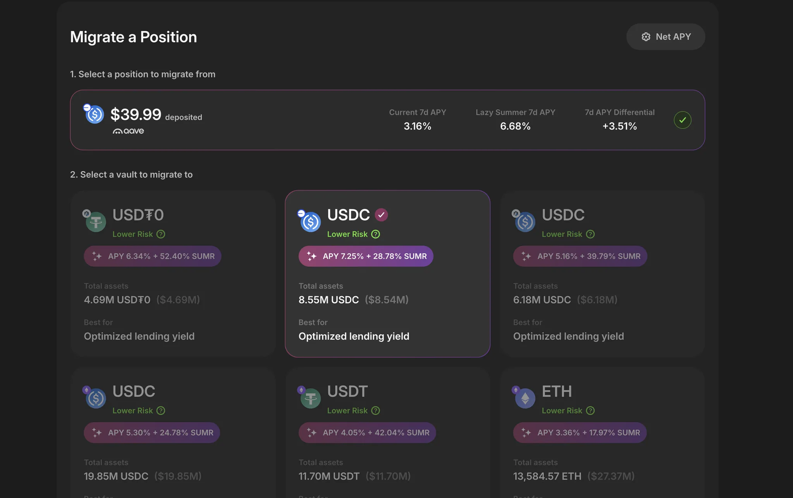 Tap Migrate and move positions from Morpho, Aave, or Compound straight into a Lazy Summer vault. No withdraw/swap/redeposit, no market gap—AI keepers start rebalancing instantly.