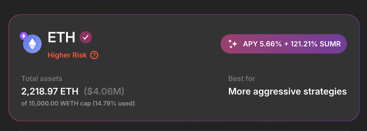 A new ETH vault tier that targets more aggressive strategies (morpho lending, leveraged stETH loops, etc.) with tighter guard‑rails from Block Analitica so that risk is still kept in check. Right now, this vault also has the highest SUMR Rewards!