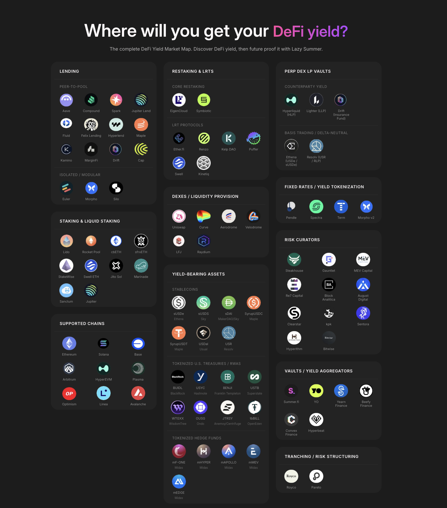 Disclaimer: Oazo Apps Limited functions solely as a front-end interface (Summer.fi) provider and it does not act on behalf of any user. Oazo Apps Limited did not launch nor does it operate or control the Lazy Summer Protocol. The Lazy Summer Protocol is accessed through Summer.fi. The information provided herein is provided on behalf of the Lazy Summer Foundation which launched the Protocol for informational purposes only and it does not constitute investment advice. Oazo Apps Limited and the Lazy Summer Foundation are not soliciting or recommending any transaction or guaranteeing any specific returns. Users interact with the Protocol at their own risk. T&C for the use of Summer.fi apply.