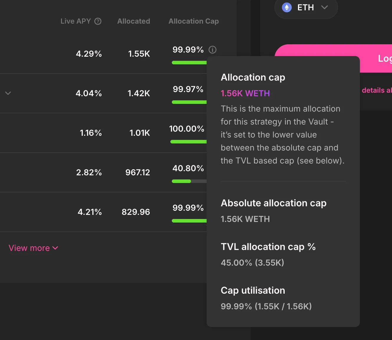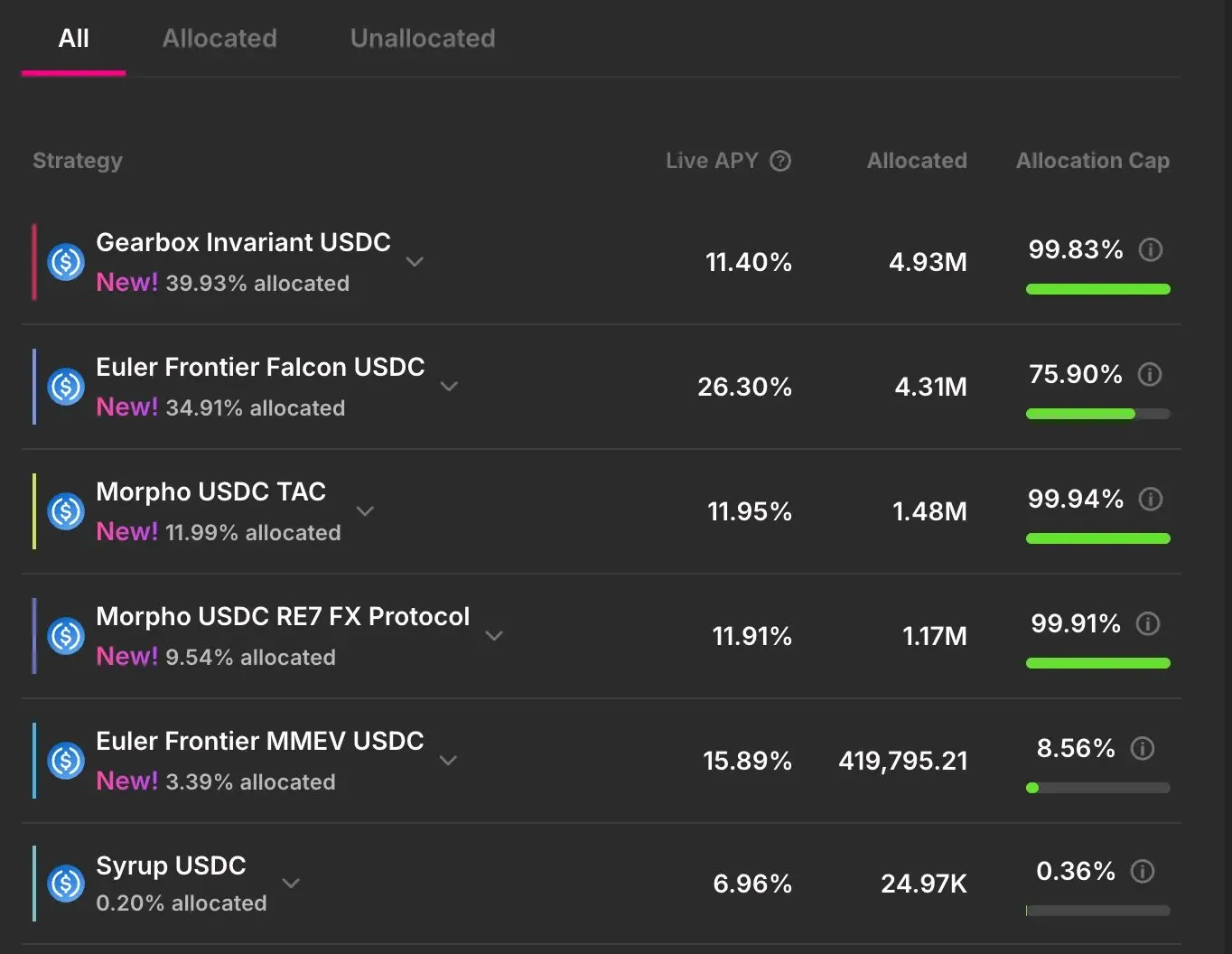 Each vault distributes capital across multiple protocols and curators rather than concentrating in a single venue. Allocation caps prevent over-exposure to any one market, if a new yield source is attractive but unproven, the cap might be set at just 5% of the total vault, giving the portfolio exposure to upside while keeping 95% protected if that source underperforms.
