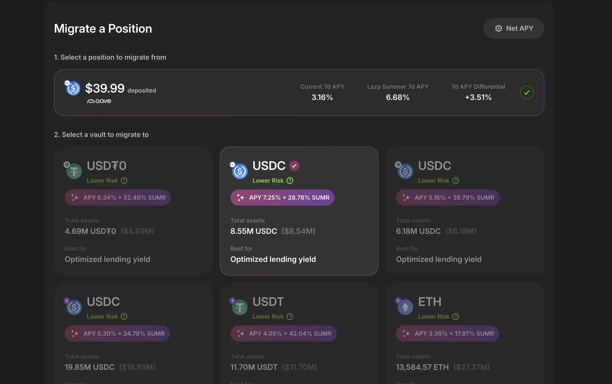 Our new migration feature makes it effortless to move your positions from Morpho, Aave, or Compound into Lazy Summer Protocol—all in a single transaction.