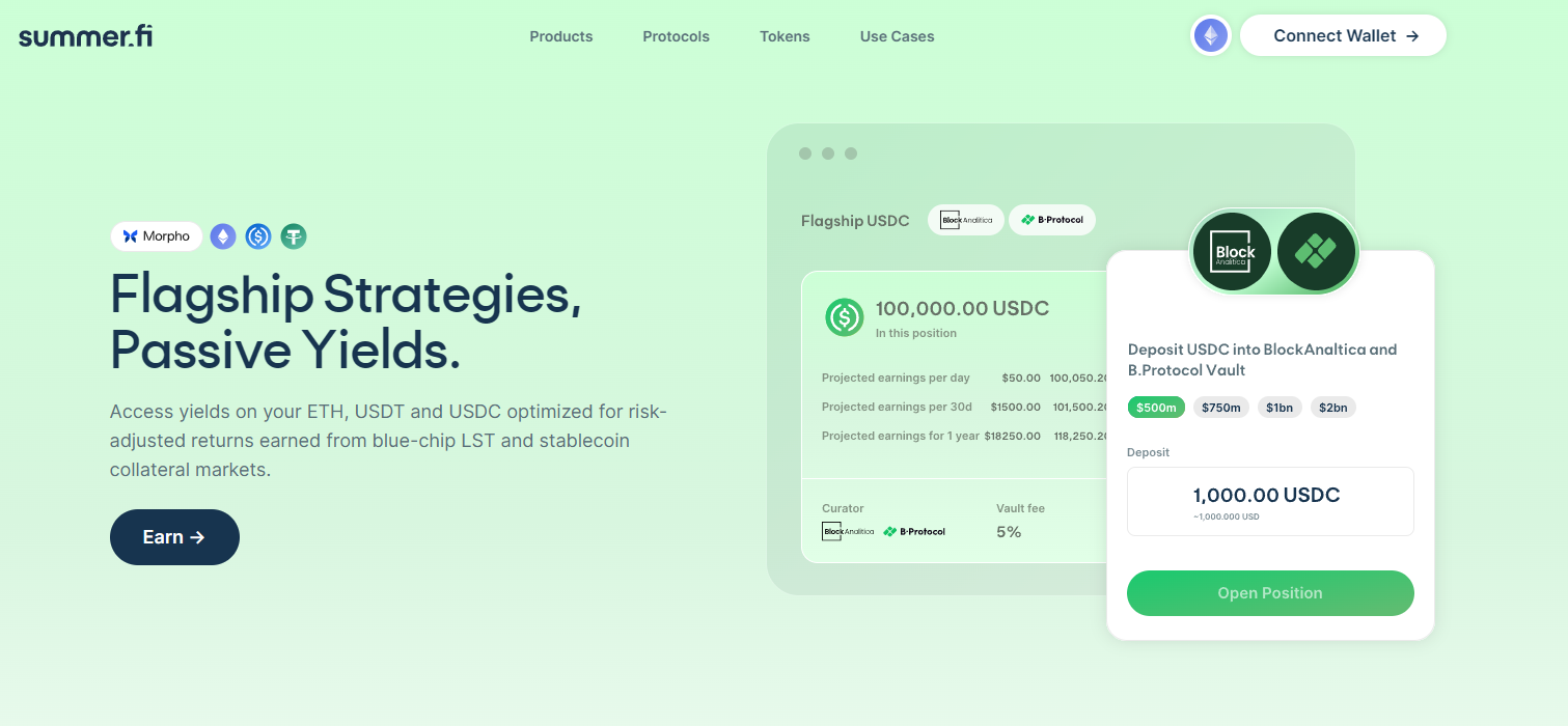 Go to Summer.fi, choose the Vault that fits your requirements, and deposit your chosen stablecoin or LST for the ETH vault, experiencing little to no swap fees. The process is streamlined and tailored for ease of use.