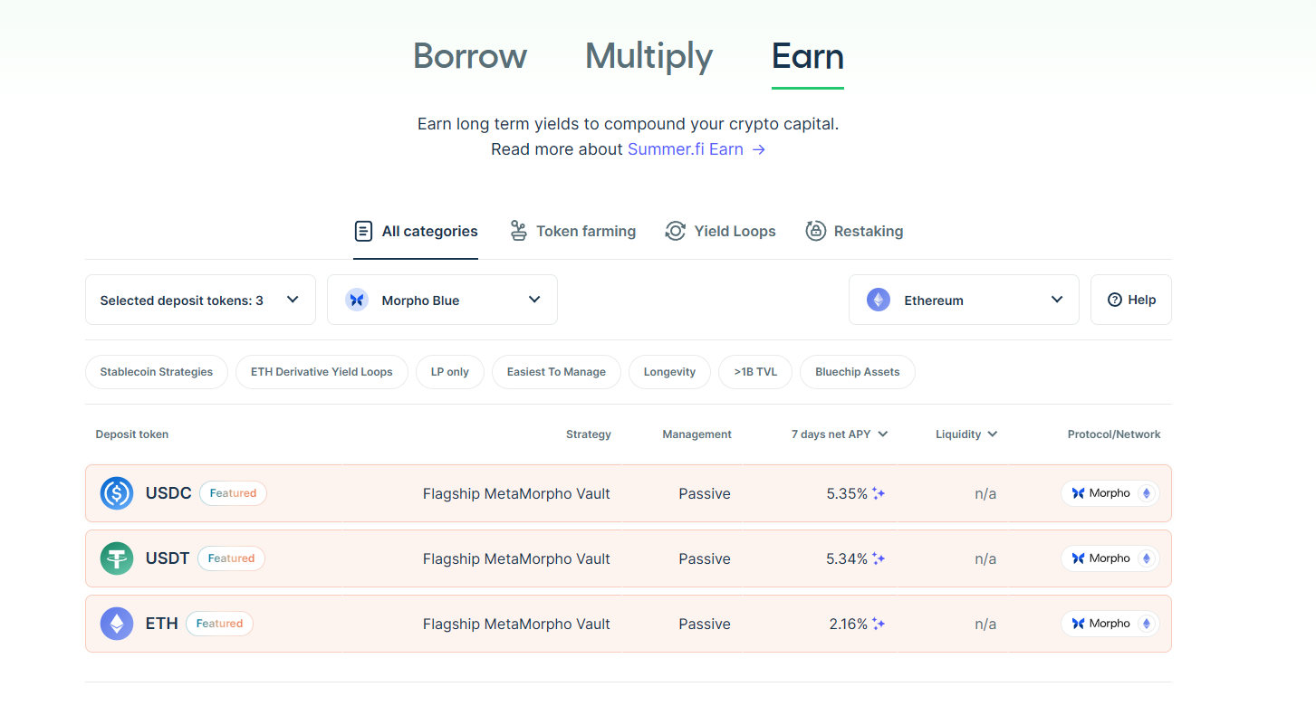 Block Analitca and B.Protocol have chosen the most advantageous Morpho markets for lending. They provide a yield that surpasses the risk-free rate for stablecoins and delivers a considerable yield on ETH. This is achieved with considerably lower risk than other lending protocols such as Compound or Aave. You can deposit USDC, USDT, or ETH into these newly established vaults and receive $MORPHO rewards and the APY. On Summer.fi you can see your earnings to date and the 30-day yield average.