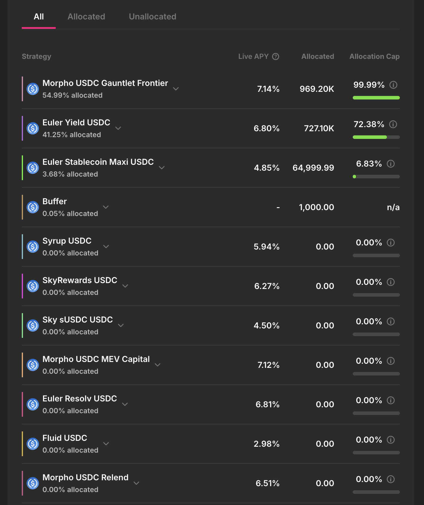 - You deposit into a vault (like USDC Higher Risk), and your capital is spread across multiple strategies.