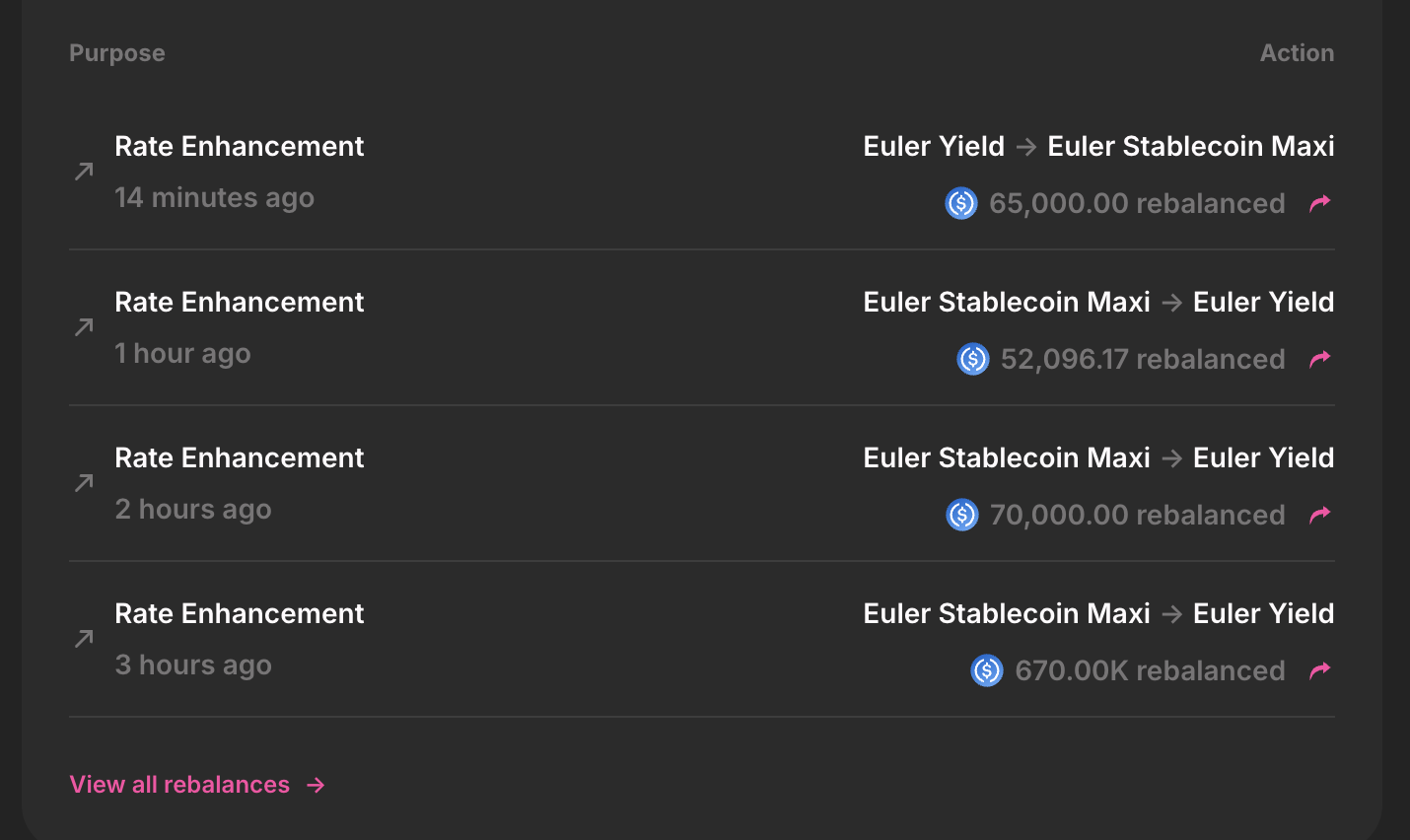 Euler Stablecoin Maxi A yield-maximizing approach across stablecoin lending pools on Euler. Designed to move across underutilized pools for excess returns. Yield Source: Lending stablecoins with lower utilization thresholds.