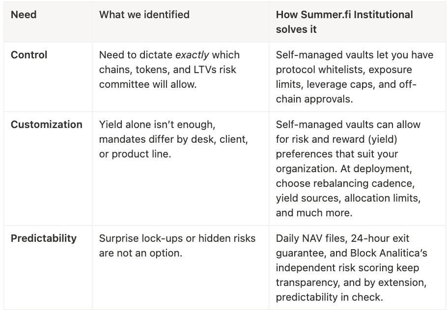 Like all good innovations, Summer.fi Institutional was born of observing painful necessity. Through analysis of banks, hedge funds, centralized exchanges, and DAO treasuries, three core institutional needs emerged: